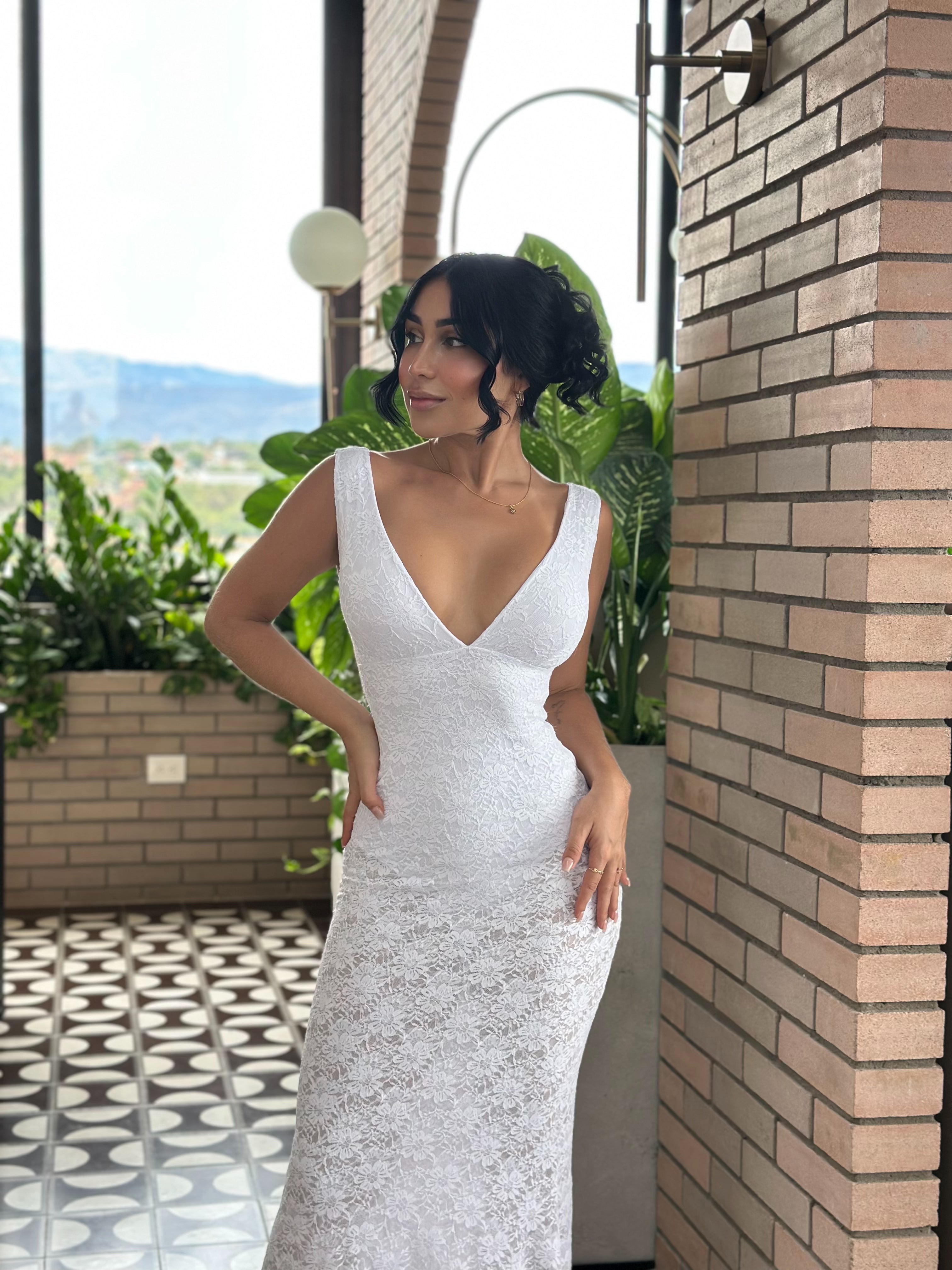 Este vestido largo en tono marfil evoca la pureza de los pétalos al amanecer. Su diseño con escote profundo y silueta ceñida realza tu figura con elegancia natural, mientras su textura delicada aporta un brillo sutil y etéreo.